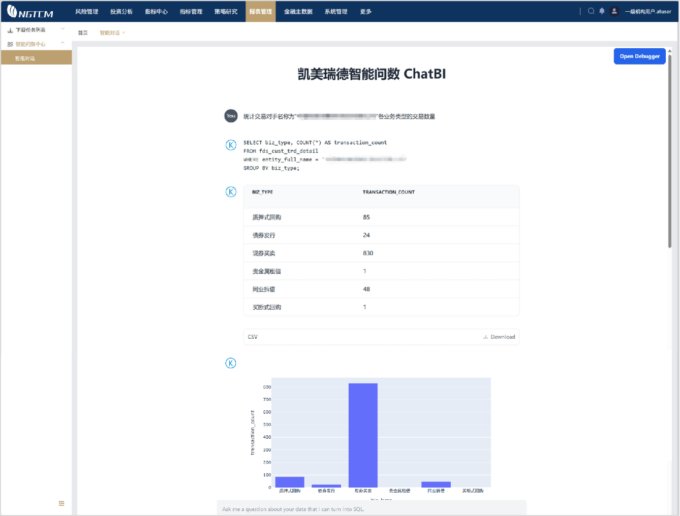凯美瑞德ChatBI以“自然语言理解 + 智能代码生成 + 全场景兼容”为技术内核,重构金融数据价值链: