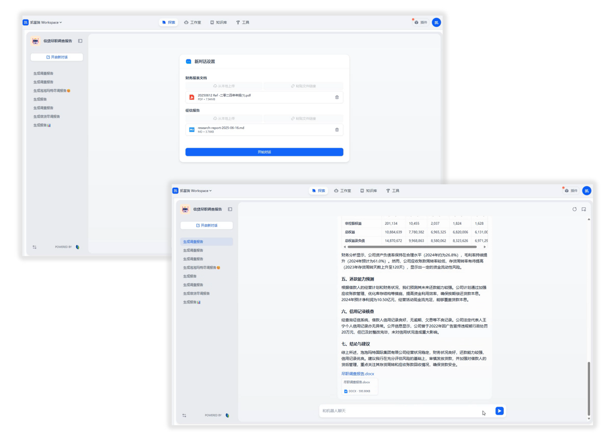 面向银行对公信贷业务与信用债券投资业务。通过自动整合财务、征信、经营等多维数据,快速生成《企业尽职调查报告》,有效解决手动录入易错、分析耗时等问题,提升企业审查与信用评估的效率与质量。